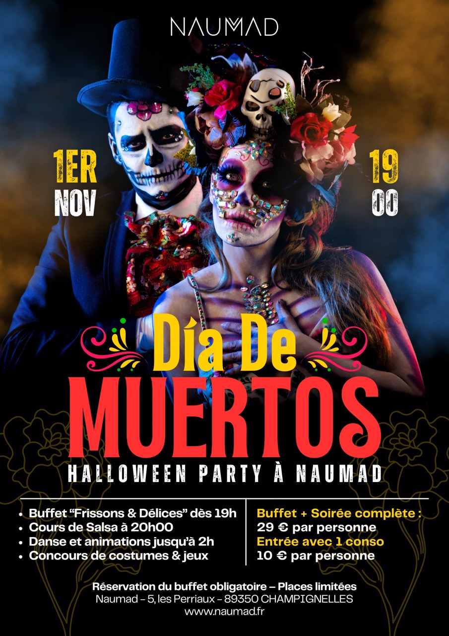 Plongez dans l’ambiance envoûtante du Día de los Muertos au Domaine Naumad. Dès 19h, un buffet gourmand et terrifiant vous attend, suivi d’une soirée dansante où salsa, bachata, zouk, merengue... s’enchaînent jusqu’au bout de la nuit. Concours de costumes, jeux et décorations viendront rythmer cette fête unique, entre frissons et convivialité.
